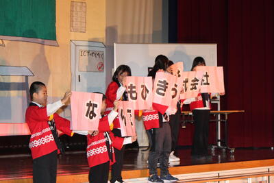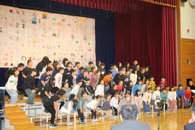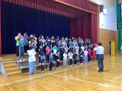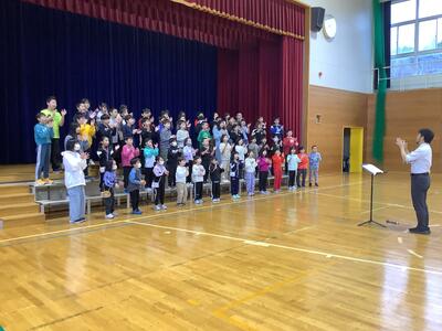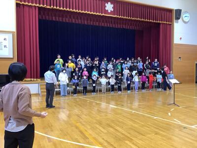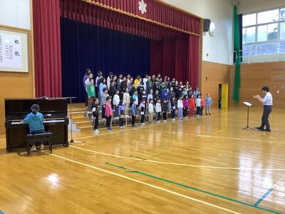 今日は朝活動の時間で全校合唱の練習を行いました。はじめは歌詞や動きを忘れかけていて自信がない様子でしたが、練習を通して学芸会のレベルに近づいていきました。