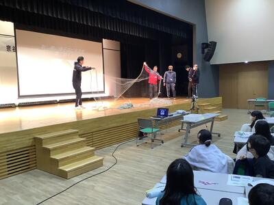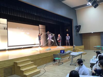 実際の漁網を広げ、ほっけが網にかかるところを再現