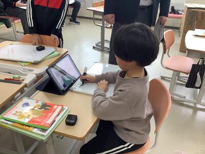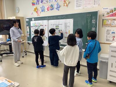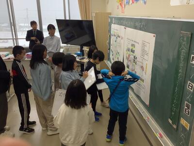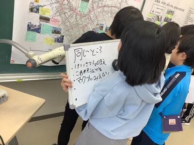 3年生が「安全」について考える授業に臨みました。主に交通安全の観点から、3年生が作成した「自分たちが危険だと感じる場所のマップ」と、地域の大人が作成した危険箇所マップを比較し、共通点や相違点を見つける中で、安全を確保するにはどうしたらよいかを考える授業です。3年生は進んで黒板に張られた2つの図を見比べ、ホワイトボードに意見を書き入れていました。