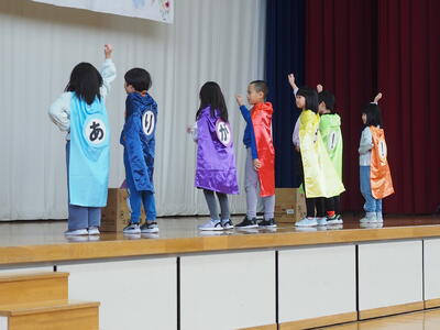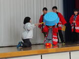 本来ならいただいた豆をぶつけるところですが、食べ物を大切にする観点から豆の代わりに紅白玉を用いました。低学年の中には「怖い~」という子もいましたが、みんなそれなりに豆まきイベントを楽しむことができたようです。