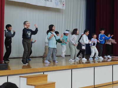 1年生は「前向き」ダンスと6年生も参加の「大きなかぶ」の寸劇