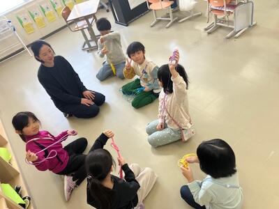 1年生は縄跳びの結び方の練習です。いつも2年生に助けてもらいながら結んでいますが、来年になったら助ける側になります。自分ができるようになることはもちろん、どうやって説明するか実際に口にしながら練習していました。