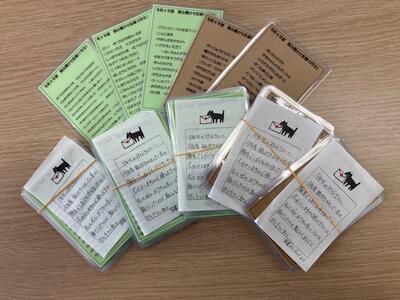 カードの裏には「これからも たくさんの「本」との出会いがありますように」のメッセージとボランティアメンバーの名前がありました。出会いのきっかけをたくさんつくってくださった、図書ボランティアの方に感謝です。来年度もよろしくお願いします。
