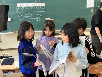 4年生はグループ学習で算数のまとめをしていました。立方体・直方体の展開図から平行な辺や面を探したり、辺と面の関係について調べていました。わからないところは教え合いです。説明する=言語化することで理解が深まっています。「垂直に交わる」「辺の長さが等しい」など正しい「算数言葉」を使わないとうまく説明できません。算数であっても言葉は大事です。