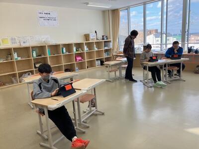 担任の先生とALTの先生と4人で学習です。タブレットを使って英単語のゲームに取り組んでいます。