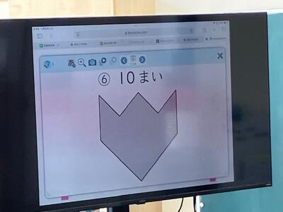 1年生はタングラムというのを学習しました。合同な直角二等辺三角形を10個つかって、大画面に示された図形になるよう組み合わせていきます。