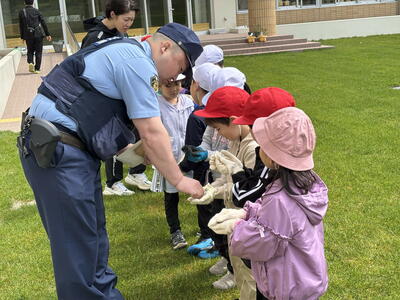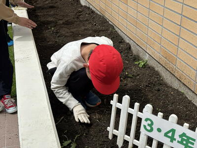 本日、沓形駐在所の秋元さん、仙法志駐在所の坂本さんにお出でいただき、1年生が学校花壇にひまわりの種を植えました。