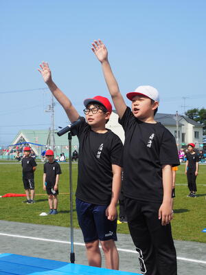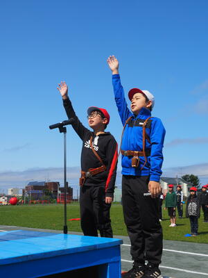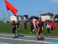 運動会は予報の関係で、当初の15日(日)開催を繰り上げ、14日(土)の開催となりました。6時頃に雨が降ったものの、その後は天候が回復し、晴れ間が広がりました。ただ、風が強く、児童テント、本部テントが飛ばされそうになり、途中で屋根の布を外したり、テントを解体したりしなければなりませんでした。