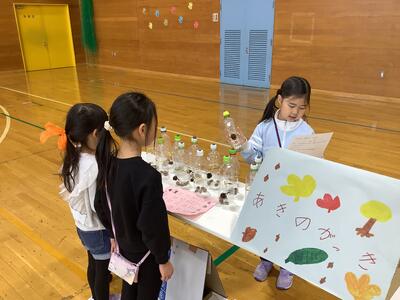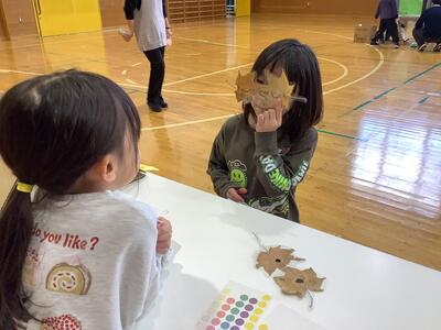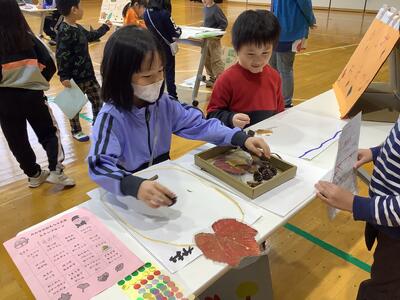 生活の学習で、1年生は落ち葉やどんぐりの実などの秋の自然物を生かしたものづくりをしました。