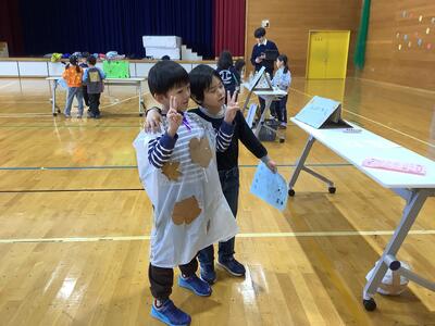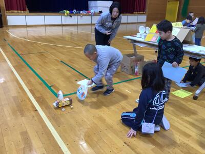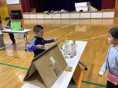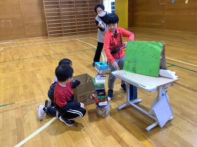 2年生は身近な材料を組み合わせて、遊びに使える物を作ったり、作った物を使った遊びを考えたりしました。