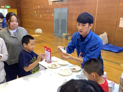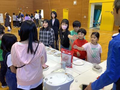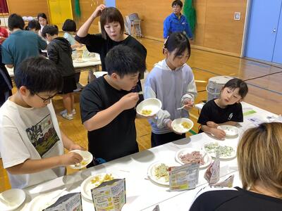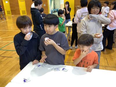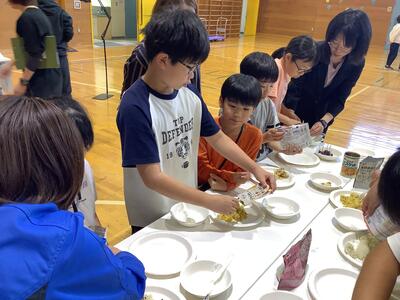 準備した非常食を試食しました。子どもたちからは「おいしい!」という声が。