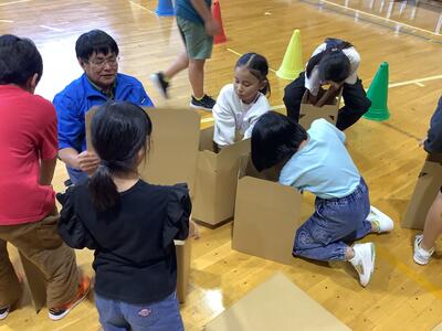 今年度から全校児童の参加です。利尻町役場防災情報室、稚内地方気象台に協力いただき、防災や災害発生時の生活について、「作る」「知る」「食べる」「磨く」「出す・寝る」の5つをテーマとした、学びや体験をしました。学びは全体で、体験は縦割り班をベースにした5つのグループ別で行いました。