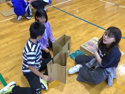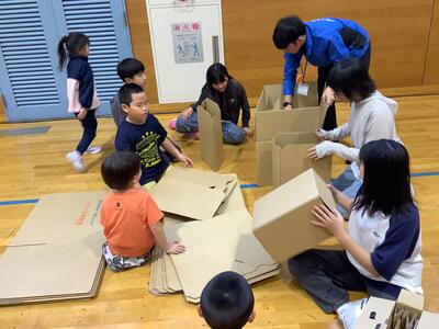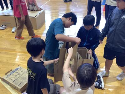 排泄・睡眠も重要な要素です。施設・設備が使えない場合を想定して、段ボールで簡易トイレ、簡易ベッドづくりを体験しました。