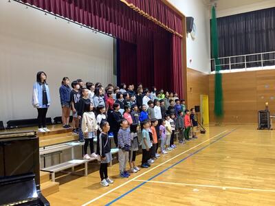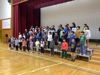 今日は朝活動の時間で全校合唱の練習を行いました。はじめは歌詞や動きを忘れかけていて自信がない様子でしたが、練習を通して学芸会のレベルに近づいていきました。